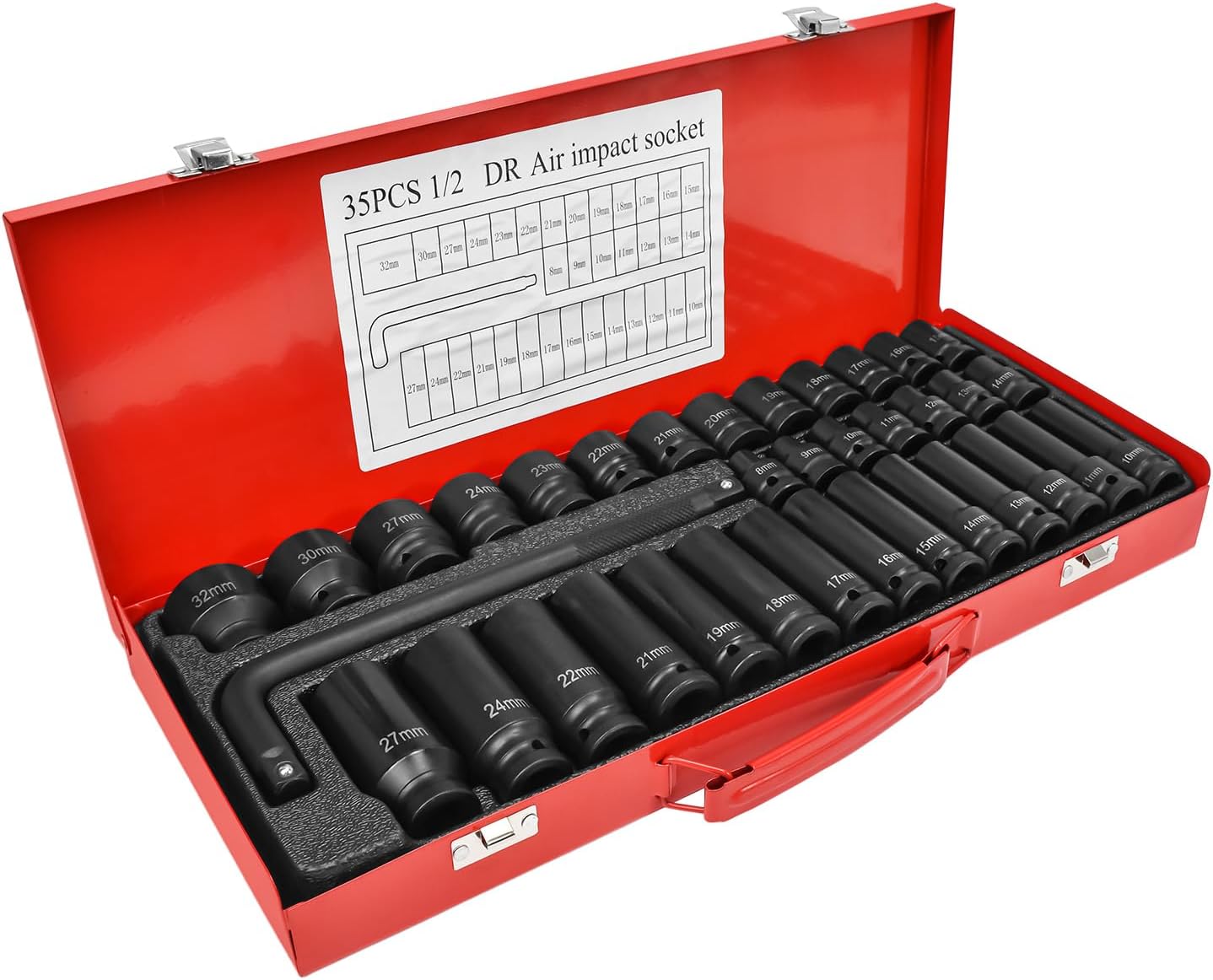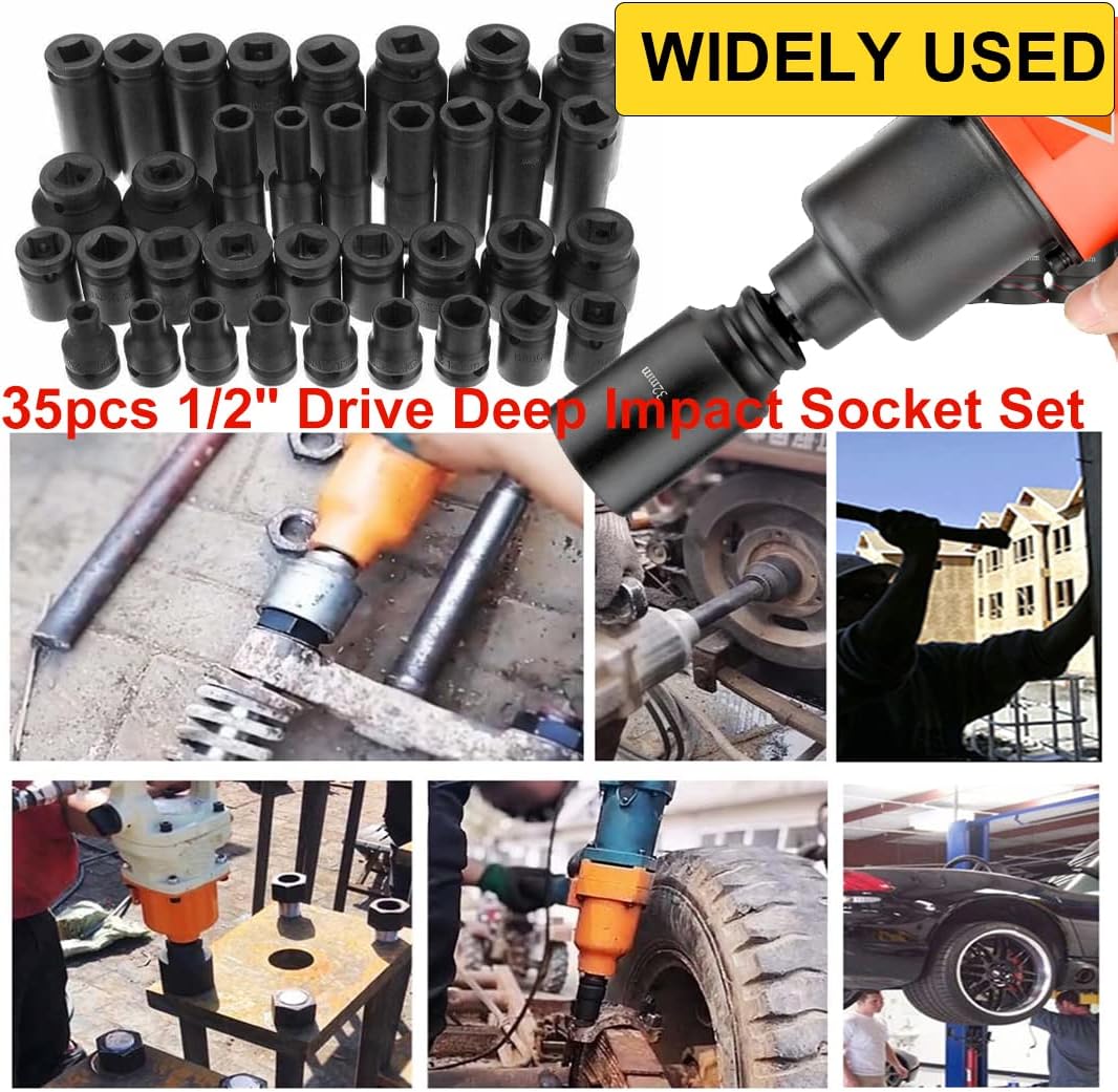 ★【Durable& Sturdy】 Made of high quality Cr-V Steel;Drop forged and heat treated with black corrosion resistant finish-Stain resistant,rust resistant ;Designed to withstand high amounts of torque from your impact wrench with minimal risk of damage to bolts and nuts;★【Drive Size】 1/2 inches;Long Sleeve Length: 78mm/3.1in-Metric 10mm · 12mm · 13mm · 14mm · 15mm · 16mm · 17mm · 18mm · 19mm · 21mm · 22mm · 24mm · 27mm · 30mm · 32mm;Short Sleeve Length: 38mm/1.5in-Metric 8mm · 9mm · 10mm · 11mm · 12mm · 13mm · 14mm · 15mm · 16mm · 17mm · 18mm · 19mm · 20mm · 21mm · 22mm · 23mm · 24mm · 27mm · 30mm · 32mm;★【Easy to Read/Identify】 All deep impact sockets are engraved with size mark for quick identifies drive socket specs and measurements.★【Convenient & Easy to use】6-point flank drive design grips fastener more tightly on the flat sides and prevents rounding off at corners under high torque and hammering stress with use of impact and electric wrenches; Can be used for pneumatic electric and cordless impact wrenches★【Storage Case 】Come with heavy duty storage for easy and convenient transport and storage★【Application】Useful tool kit for automobile repairing and maintenance;perfect for home, car, work places.