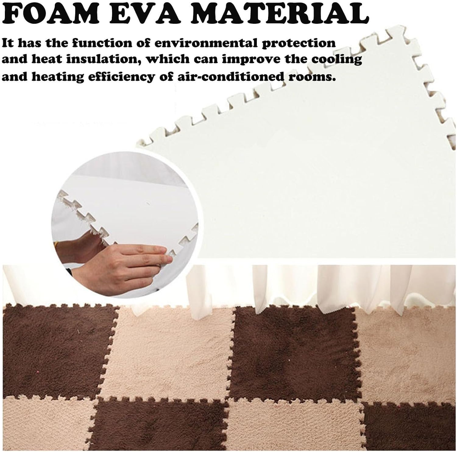 Product advantages:Soundproof, shockproof, waterproof, thermal insulation;Easy and smooth laying, specific anti-skid surface; thickness 1CM;The thickness is 1CM, which reduces the impact when playing. It can also be used as a gymnastics mat indoors, which is convenient for storage.parameter:Product name: Classic splicing floor matMaterial: plush + EVA foamWeight: 0.06KG/1 pieceSize: 30*30*1cm/12*12*0.4inQuantity: 9 piecesInstructions:Please open the package before use and place it in a ventilated place for a while to fully dissipate the residual weak odor.Please assemble according to the teeth and you can make any creative combination (there are teeth on the 4 sides for connection. The laying is simple and smooth)If you need to clean, please wipe with a wet towel, vacuum cleaner, wash with waterNote:The color may vary due to different monitors and shooting angles, please refer to the actual product.