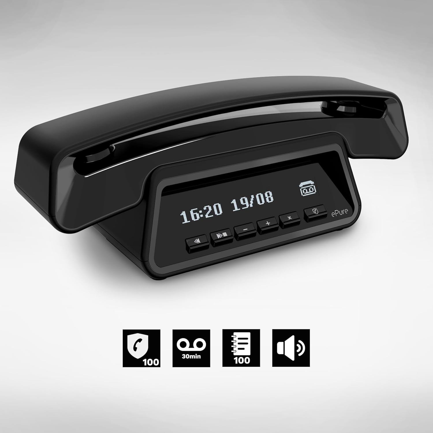 | BuiltIn Media | Answering machine in the base, Line Cable, RJ11 Telephone Connection Cable, User Manual, ePure Premium Phone Black |