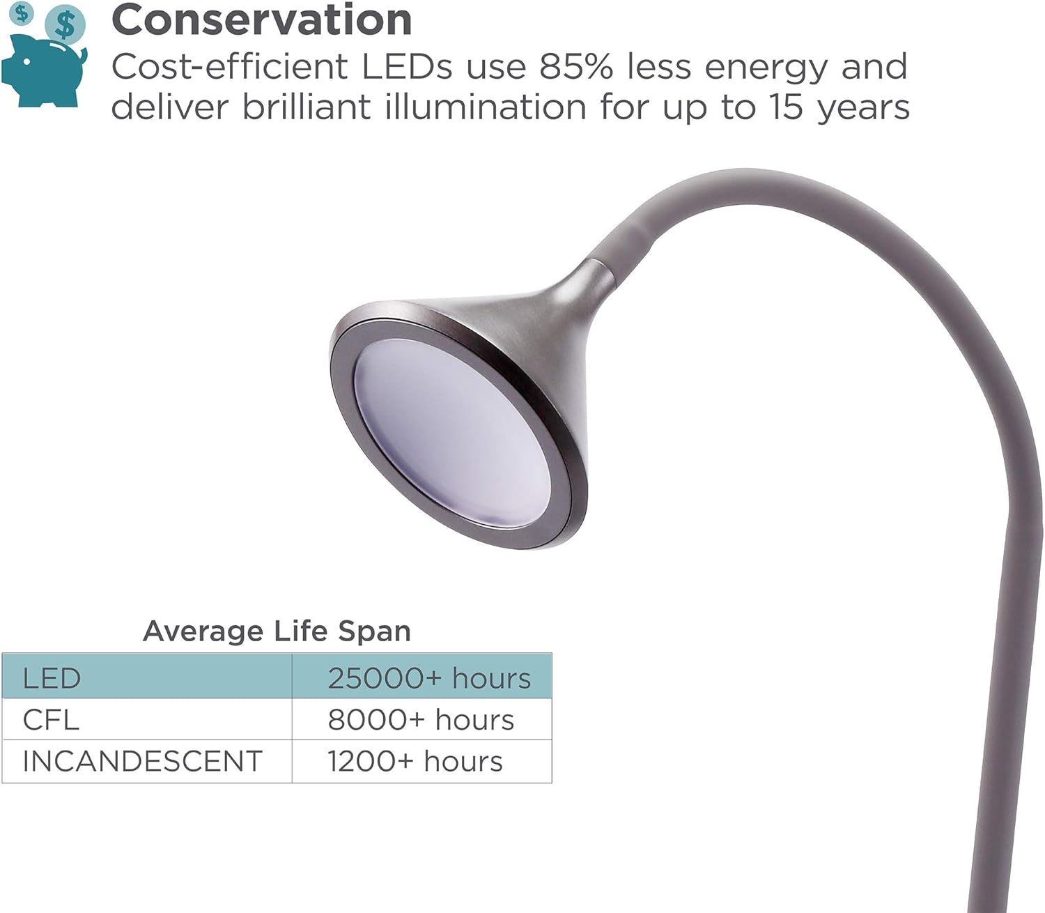 The most minimalist lamp you'll ever come across. Great for sleek, modern spaces, this LED gooseneck lamp provides just the right amount of light. Simply select the brightness out of three different settings using the dimmer function. It features a bendable neck to position the light anywhere it's needed. It's thin and compact so your desk is never cluttered with bulk. The USB port located on the circular base of the lamp lets you power up your phone, tablet or smartwatch without having to plug in by your feet. This LED lamp is 5 watts and mimics the look of natural daylight so eyestrain is never an issue. The muted gray tone is great for a muted toned room or one full of color!