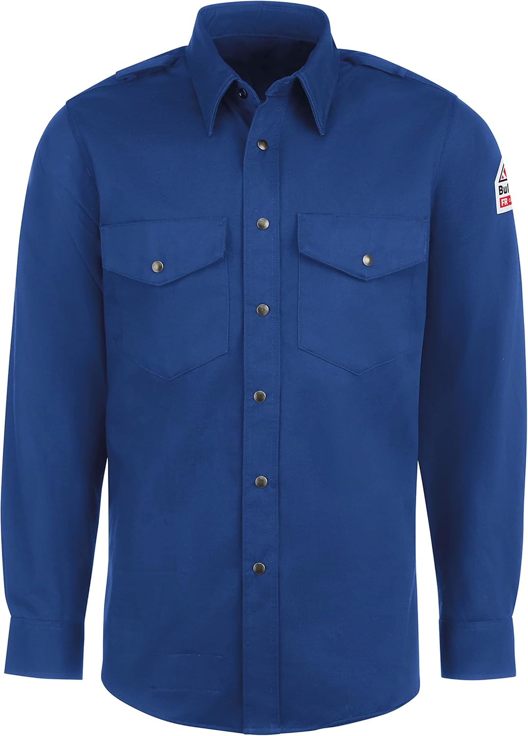 Bulwark Excel FR snap-front uniform shirt. Fabric made of 7 ounces, 100 percent cotton. Banded, topstitched collar. Two chest pockets with snap flap closures and sewn-in pencil stall. Placket front with snap closure. Topstitched cuff with adjustable snap closure. Tailored sleeve placket. Home wash and industrial wash.