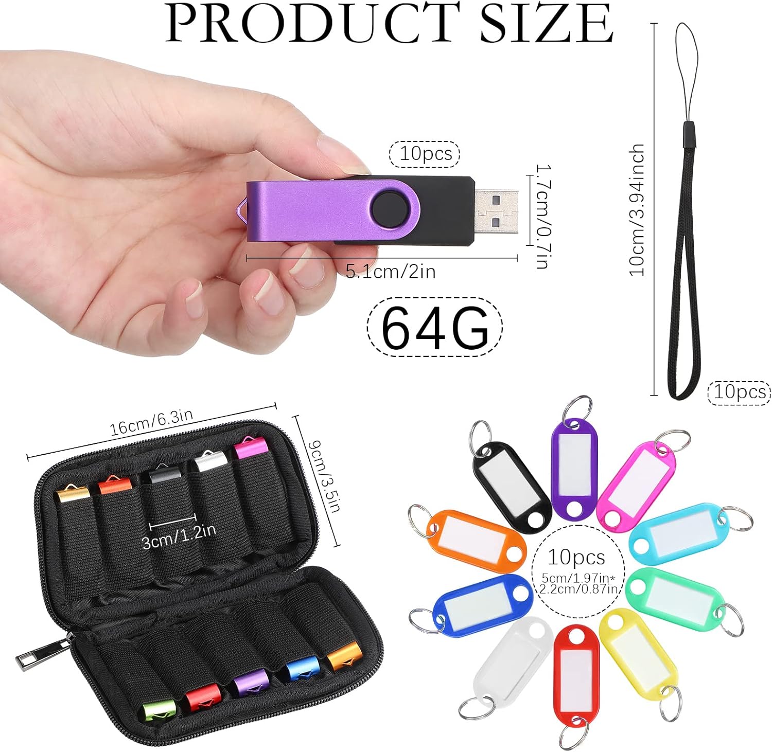 Features: Practical gifts: These 64GB USB thumb drives are very good gifts choices for teachers, students, fathers, mothers, girlfriend, boyfriend, colleagues, employees, etc., on holiday, Christmas, birthday, Thanksgiving Day, graduation, company meeting, and so on. Convenient to use: Each 32 GB USB flash drive comes with a key label, you can write the information on the blank label window of the tag, so you can quickly find what you want, and the ring design allows you to easily attach it to the swivel thumb drive, and take it with you anytime. Specifications: Main material: metal, plastic Color: multicolor Size: about 2.28 x 0.7 inch Package includes: 10 x Flash drives bulk with lanyards, key tags and storage case Notes: Manual measurement, please allow slight errors on size. The color may exist a slight difference due to different screen displays.