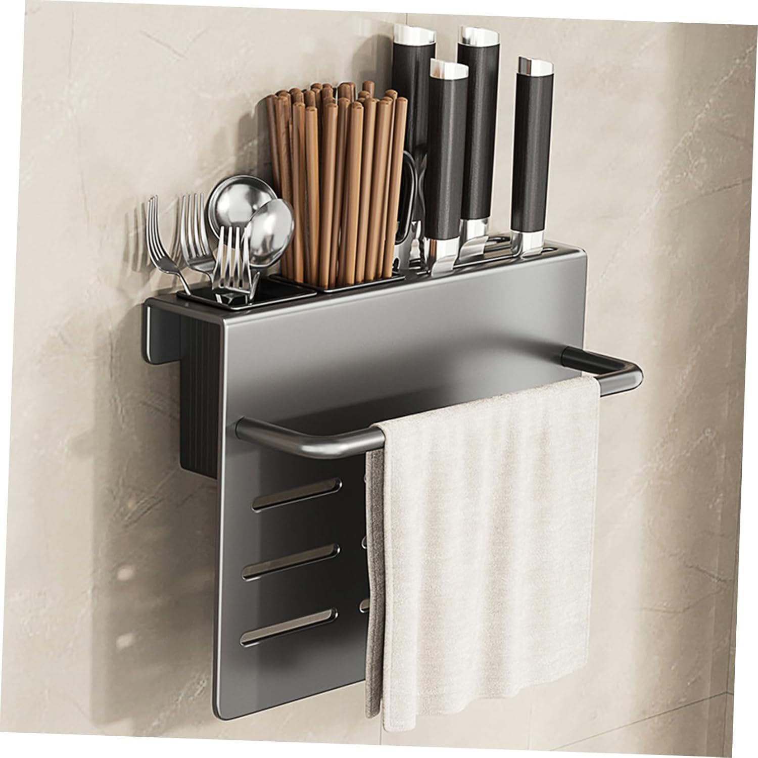 Package List 1 x Wall Organizer Features -Size:27.50X20.50X11.90cm/10.81X8.06X4.68in (whole) utensil holder for kitchen -Size:10.30X6.50X5.00cm/4.05X2.55X1.97in (removable tableware holder part) board stand -Color:Black board organizer -Material:ABS, stainless steel kitchen utensil holder -Suitable for storing and keeping kitchenware utensils accessible and tidy, and can save countertop space utensil holder for kitchen wall. -Manufactured with ABS, stainless steel material, and for long term use. With beautiful and appearance will its popularity and practicability chopsticks case. -This kitchen wall organizer doesn't take up too much space, and this cutlery holder has storage capacity daily use cutlery holder. - and simple color, with draining hole design, material, beautiful and spoon holder. -Also can be a decoration for your kitchen, can increase a kind of special atmosphere at your kitchen utensil accessory.Goods Descriptionspoon holder It is made of ABS, stainless steel material, it can your kitchen firmly, such as forks, spoons and so on.chopping board holder It will make your kitchen in order. board holder stand Flat bottom, stable standing.chopstick draining holder This item is a kitchen Chopstick Holder