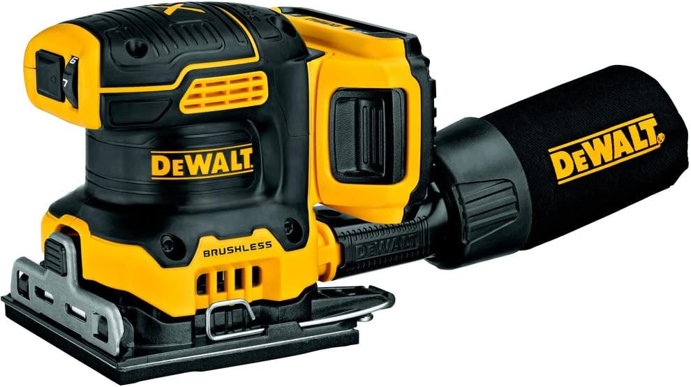 This 20V MAX* XR brushless cordless 1/4 sheet variable speed sander comes with one 2.0 Ah battery and provides you with the power and runtime needed for a variety of applications. A variable speed dial provides speed control from 8,000 - 14,000 OPM for a variety of jobs. One-handed locking dust bag attaches securely to the sander to aid in dust collection or the user can attach the sander directly to the DWV010 or DWV012 dust collectors (sold separately). Rubber overmold grip provides comfortable sanding. Paper clamp designed to hold paper securely and for ease of installation.
