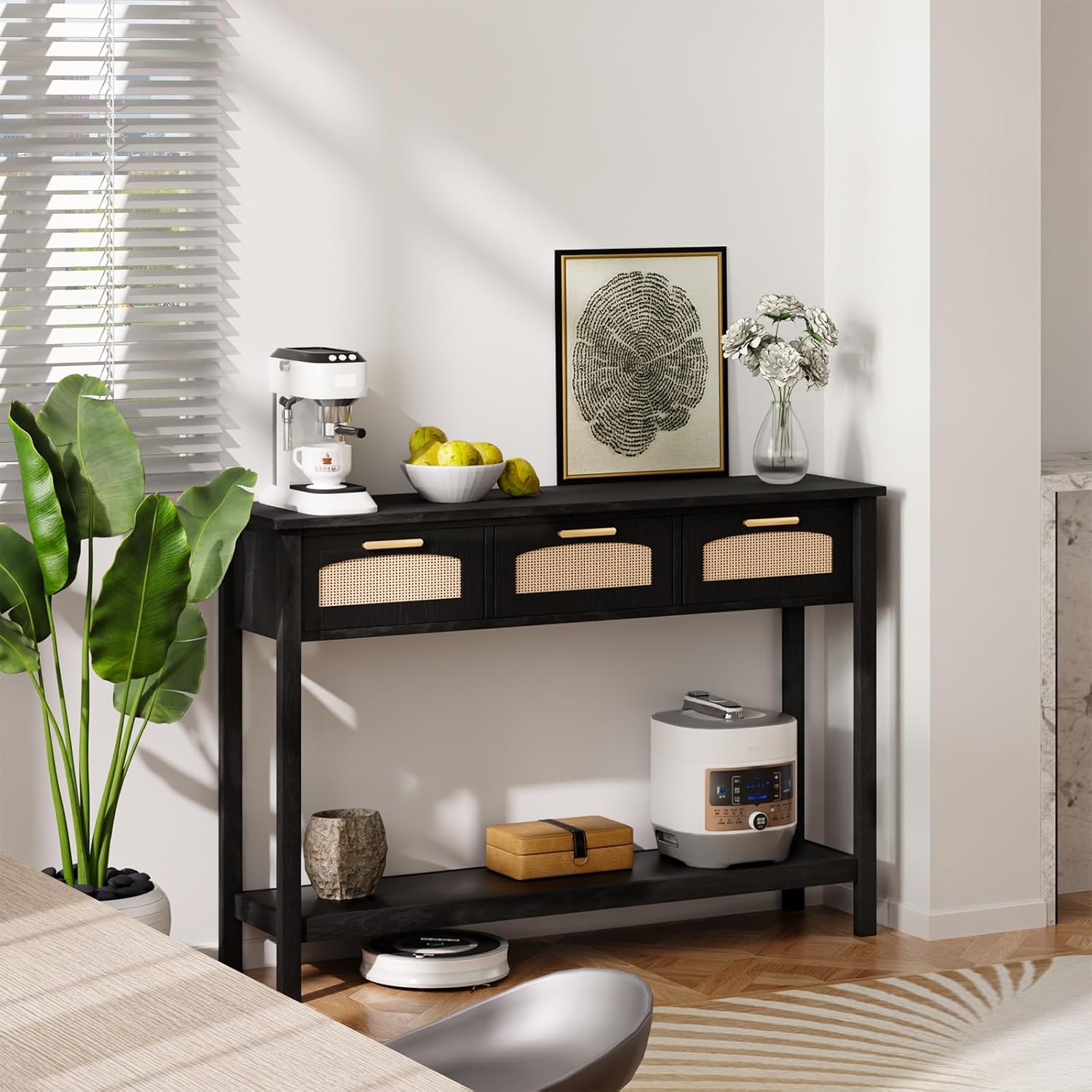 FONTOI Entryway Table, Console Table with Storage, 3 Rattan Drawers Sofa Tables with Golden Metal Handles, Wood Console Table for Living Room Hallway, Deep Black