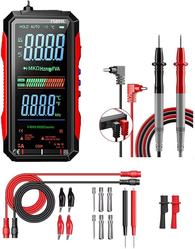 Features:for Versatile and Rechargeable: The digital multimeter is designed to accurately measure AC/DC current and voltage, capacity, continuity, resistance, frequency, non-contact voltage (for NCV), and ambient temperature. It features a rechargeable battery via for USB-Type-C providing up to 8 hours of operation after just 2 hours of charging, making it an essential tool for both home and industrial electrical issues.Large Display for Easy Reading: Equipped with a large 4.8-inch display that includes a backlight and a practical torch, this multimeter allows for effortless reading of measurements, even in low-light conditions. The data hold function enables users to store readings if the display is difficult to view.Good Features: The plastic housing is designed to protect against impacts and includes drop for protection to prevent current flow in the event of a fall.High Accuracy with True RMS: This multimeter offers precise measurements with a count capacity of up to 6000. It can measure AC voltage from 60mV to 600V with an accuracy of ±(1.5%+8d), DC voltage from 60mV to 600V at ±(1.2%+5d), AC current from 300mA to 10A at ±(2.5%+8d), DC current from 300mA to 10A at ±(2.2%+8d), capacitance from 10nF to 60mF at ±(10%+88d), and resistance from 600Ω to 60MΩ at ±(1.5%+10d).Easy to use: No complicated operations are required to use it.Specifications:Part Name:Digital MultimeterModel(Optional): FS899C,FS899L (Color screen version)Material: Plastic,MetalSize: StandardColor: Red,BlackPackage Content:A:1 x Multimeter +2 x test leads,+1 x instruction manual+1 x charging cable+1 x packaging box+1*Table Package(FS899L )B:1 x Multimeter +2 x test leads,+1 x instruction manual+1 x charging cable+1 x packaging box+1*Table Package(FS899C)C:1*FS899L Protective film