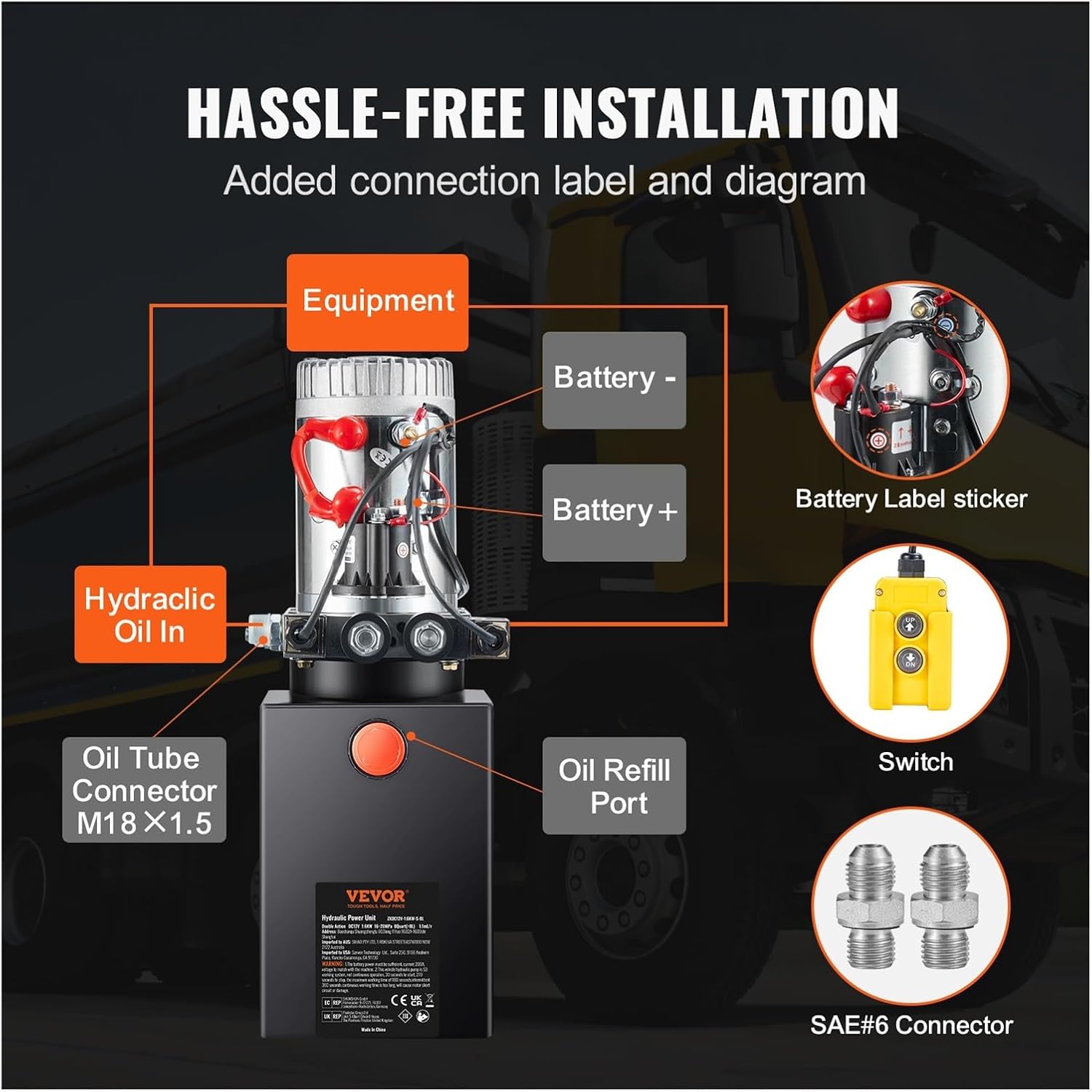 Pump Up Your Power,Compatible With VEVOR hydraulic pump features a 12V DC motor with 1.6kW power. The double-acting power unit ensures stable lifting operations. You only need to add hydraulic oil, connect the power and tubing. No complex setup required. It's versatile for large machines, shear forks, elevators, forklifts, and more.With its capacious fuel tank and powerful motor, this hydraulic pump effortlessly lifts heavy machinery, providing quick starts, precise control, and consistent reliability. Say goodbye to stalling and frequent failures.Our double-acting power device provides a dual-action lifting effect. Hydraulic oil alternates between the two ports, evenly distributing force across your equipment. This design saves energy and ensures accuracy in operation, setting it apart from single-acting power units.Please note that continuous long-term operation is not recommended. When used in an S3 working system, it operates in cycles: 30s on, 270s off, and 180s max continuous working time. For extended operation, there's an intermittent 360s continuous working time.Features & DetailsHighPowered Performance Our hydraulic pump adopts a 12V 16kW DC motor delivering a high flow rate of up to 0.91GPM. With an 8-quart tank and 16-20Mpa oil pressure, this powerhouse releases a maximum pressure of 3200 psi; the dump trailer pump can effortlessly handle heavy vehicles and machinery, lifting them with ease. Experience the power!Precision Double-Action Lifting: Designed for accuracy, our hydraulic power unit employs a double-action power mechanism. Ensures hydraulic oil works alternately in both ports, evenly distributing force across your equipment. A built-in safety relief valve automatically releases pressure if the limit is exceeded, ensuring a safer operation with fewer failures.Built to Last: Our hydraulic pump is built tough. It boasts robust overall sealing, minimizing the risk of oil leaks. The rust-proof solid metal s