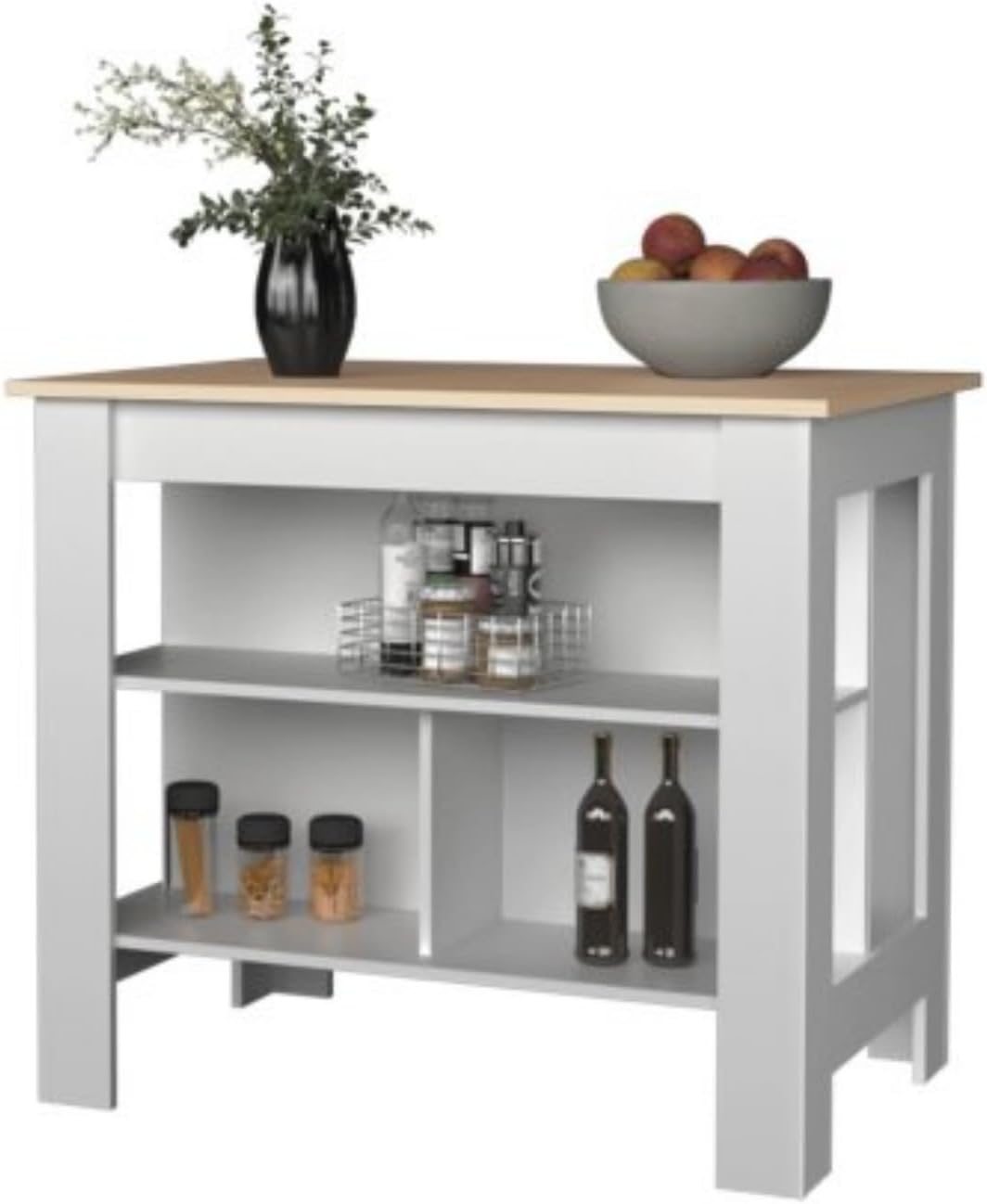 Product Information Product Type: General Merchandise Product Name: Light Pine and White Kitchen Island with Open Storage Origin: Colombia Main Colors: Beige + Black Main Material: Particle Board Use Case: Kitchen Island Width: Medium (40-55 inches) Island Type: Kitchen Cart Island Shape: Rectangular Product Dimensions Assembled Length (inches): 40.50 Assembled Width (inches): 27.50 Assembled Height (inches): 35.40 Weight (lbs): 76.00 For a sleek, modern look, the light pine and black finish combine the warm, natural charm of light pine with the stylish accents of black accents.