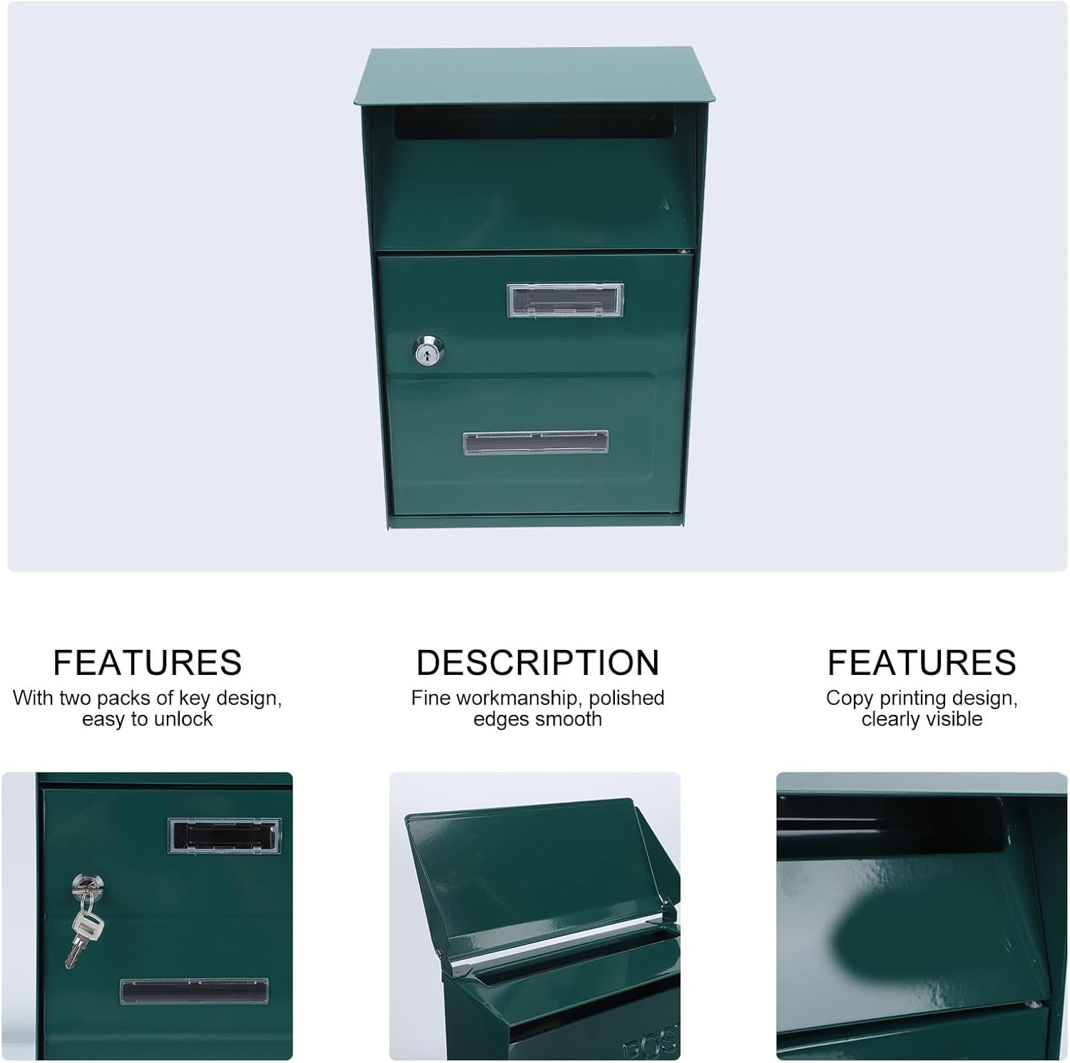 Package List 1 x letter box with lock Characteristics -Product Info:Metal mailbox - Color: Green. - Size: 32.80X20.00X9.00 cm/12.89X7.86X3.54 inch. - Material: Galvanized board. - Can help keep the confidential information of mail and complaint suggestion Metal Mailbox. - The appearance design of the product is stylish and generous, decorative and delicate vintage mailbox. - Made of great quality material, durable and sturdy, and . - With its simple design and practical functions, it will win your love well and bring you a good mount mailbox. - With a large storage capacity, you can put many mails and letters what you need retro outdoor mailbox.Goods Descriptionpost mailbox and fine workmanship that can ensure its durability and practicability.Metal Mailbox This product is a letter box with simple and delicate design.wall mounted mailbox With wide applicable occasions, perfect for interoffice mailbox, small parcels, suggestions
