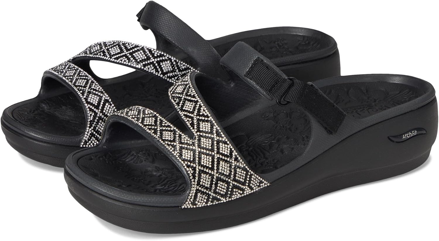 Experience exceptional comfort with these Foamies Arch Fit Ascend Show Stopper sandals for women. These sandals feature a podiatrist-designed contoured footbed developed from over 120,000 foot scans, providing superior arch support and comfort. The lightweight EVA upper with bead embellishments and adjustable cross strap offers both style and customizable fit, while the Luxe Foam cushioning ensures all-day comfort. Perfect for those seeking comfortable sandals for women with premium arch support.