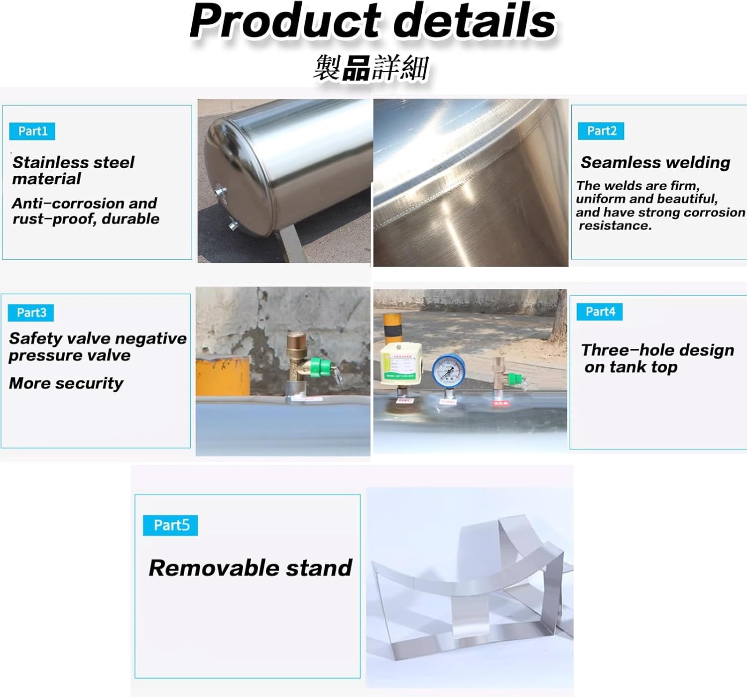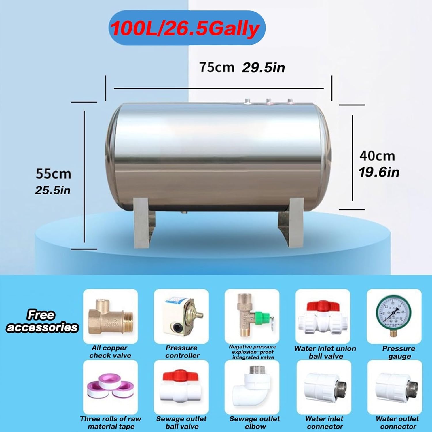 The pressure tank is made of 304 stainless steel, and can be directly in contact with water, which conforms to the standard of human edible water.200L/52.8Gal Stainless Steel Pressurized Water Tank, Horizontal Large Capacity Well Pump Pressurized Water Tank for Home/Farm/GardenOne of the outstanding features of our pressurized water tanks is their energy efficiency. By optimizing pump circulation, it can significantly reduce energy consumption, resulting in significant savings on electricity bills over time. Q&A.Q: Under what circumstances is a pressure tank needed?Answer: The pressure tank increases the water pressure and stabilizes the water pressure (especially when the tap water fluctuates and the water heater cools and heats, it turns the well water into convenient tap water, which can be connected to water heaters, solar energy, toilet flushing, washing machines, farms, etc.). Hot and cold), turning well water into convenient tap water, which can be connected to water heaters, solar energy, flushing toilets, washing machines, farmland irrigation, farmland toilet flushing, automatic water vending machines, purified water machines, and good equipment for regular water intake after the water is cut off.Question: Is the stainless steel material used in towerless water supply harmful to the human body?Answer: Stainless steel is a kind of high-alloy steel that does not rust and has a beautiful surface. It does not need to undergo surface treatments such as color plating and painting. Therefore, it is odorless and hygienic and can be in direct contact with drinking water. Direct contact with drinking water.Tip.Pressure tank containers need to be equipped with water pumps to operate properly. This link does not include water pumps.Parameters.Product name: Horizontal Water Reservoir TankProduct material: 304 stainless steelProduct color: silverThe pressure expansion water