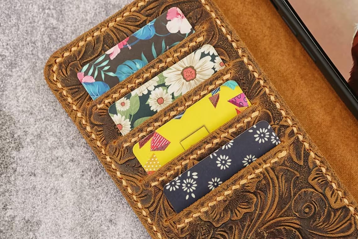 Imagine leaving the house with just one item. This leather phone wallet combines your phone and essentials in a single, compact folio. The floral tooling is cut from genuine leather and finished by hand, so the piece you carry has character from day one and gains even more with use.We insist on hand sewing because it lasts. The two-needle saddle stitch, done with heavy waxed thread, creates a seam that stands up to daily bends and tugs and is less prone to unraveling than typical machine lock-stitches. Inside, four card slots and a cash pocket handle your ID, transit card, and a couple of bills, while the snap closure and wrist strap keep everything secure on the go.Choose your iPhone model, slide it in, and you’re ready for commute, coffee runs, and weekends—no bulky pocket bulge, no digging for your wallet.