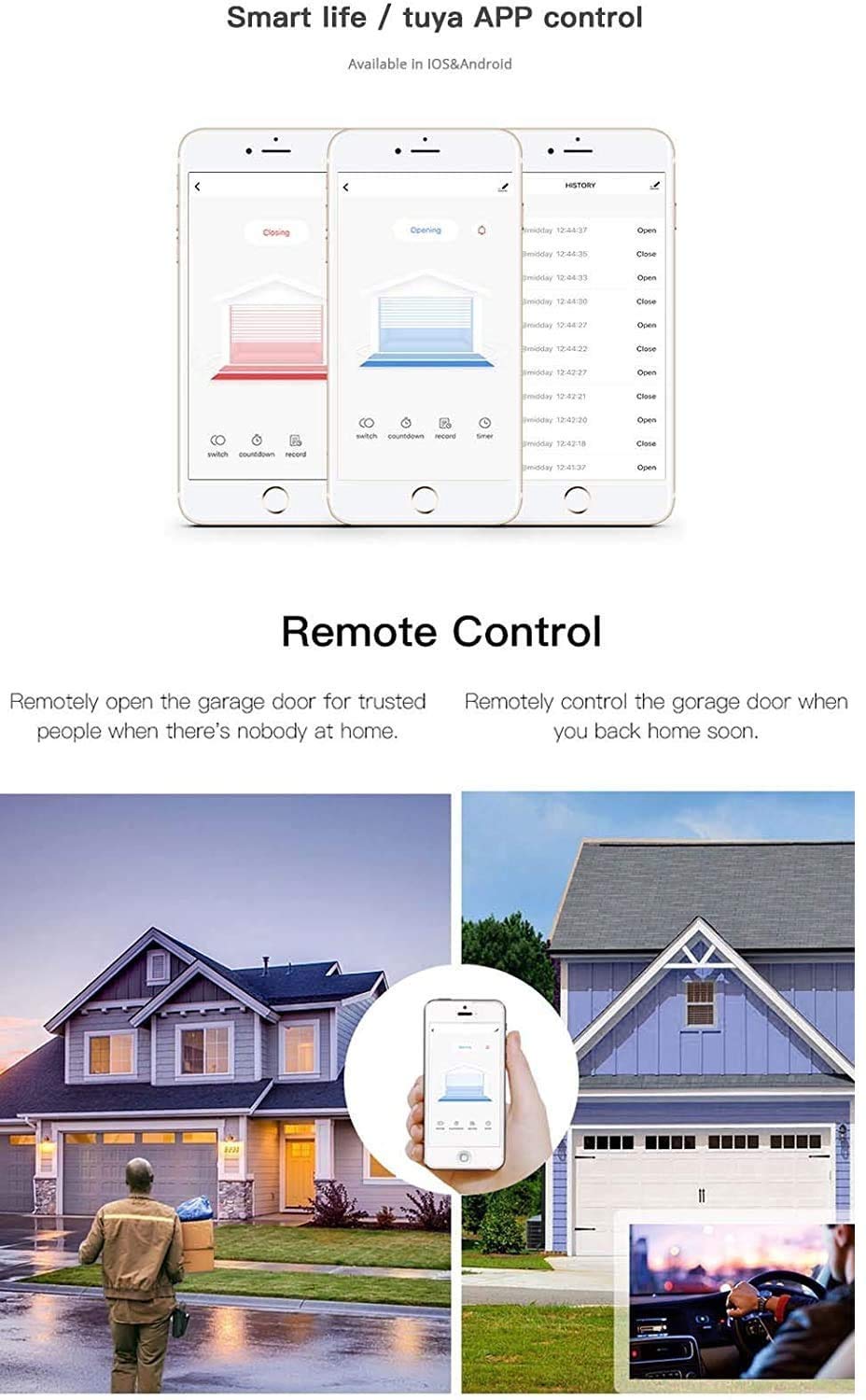 MHCOZY WIFI Inching Relay,DIY Smart Garage Door Opener, Remote Compatible Door Openers Control Using Smart Phone, Amazon Works with Alexa and Enabled Devices.OPEN & CLOSE GARAGE DOOR by your Phone ,MHCOZY Inching Relay connects to 2.4Ghz WiFi network and your existing Garage Door opener ,pairing with your eWelink account,which can be free load on both Android and IOS Phone. controlled and monitored from anywhere. Voice Control and Easy Share Control , The garage door opening and closing could be controlled in multiple ways – either through simply tapping your smartphone app, or by giving voice commands to your Alexa enabled devices.You could authorize multiple individuals to access your garage even remotely open/close the gate when a guest has to access your garage History Record & REMOTE MONITORING,you don’t have to worry if you forgot to close your door,you could seeing the status on Ewelink and Alexa App , and you can look at 5 group opening/closing logs to be sure of your garages security. EASY INSTALLATION WITH WIDE COMPATIBILITY,MHCOZY Garage Door Opener can compatible with most major garage door openers. it can't work with any garage door opener with Security+ technology are not compatible, please Test Compatibility Before Order: Take a wire with both ends stripped or a straightened-out paper clip and put each end to the same terminals as the wall button wires are terminated to. By doing so, if your door activates, then your garage door opener is compatible with by default. If the door does not activate, then the opener is not compatible by default. Noted: The device can not connect to 5G-WiFi/mesh WiFi/WiFi hue/WiFi bridge, only 2.4G-Wifi is supported Package include 1pcs 5V wifi inching relay,3m cable with sensor.